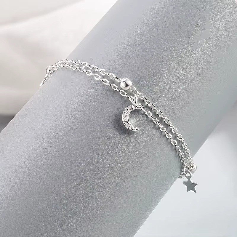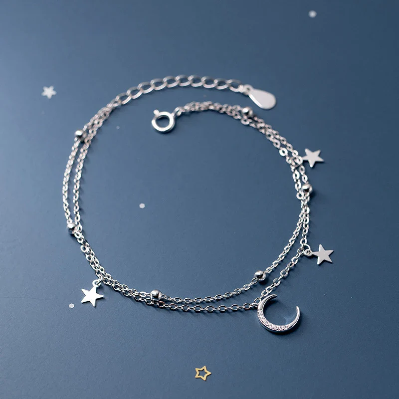 0 reviews Starlit Orbit Bracelet Was Now $12.99 Sale A hush of night sky for your wrist. Two fine 925 sterling chains orbit a polished crescent and scattered star charms, each mirror‑bright and gently mobile. Adjustable with a spring‑ring clasp, the Starlit Orbit slips effortlessly into stacks or stands alone for a quietly celestial finish. 🌙✨DetailsMaterial: 925 sterling silverFinish: high‑polish, mirror shineDesign: double chain with polished crescent + star charms; delicate orbital silhouetteFit: spring‑ring clasp with short extender and teardrop tag for easy adjustment; stackableWeight: ~5 gStyle notesLayer with slim bangles or the Twisted Lunar Wave Bracelet for a moonlit stackSubtle, everyday sparkle that transitions from daytime minimal to evening soft glamCareKeep dry; avoid lotions, perfumes, and poolsWipe with a soft, dry cloth after wearStore in a soft pouch; avoid pulling on chains and charm Material Select Material 925 Sterling Quantity Enter an amount $ Add to Cart Add to Cart ACCEPTED HERE Customer Reviews No reviews yet. Write a Review You may also like Previous Next Sale Starbright Crescent Necklace $13.99 Sale Twisted Lunar Wave Bracelet $12.99 Sale Moondrop Pendant Bracelet $12.99